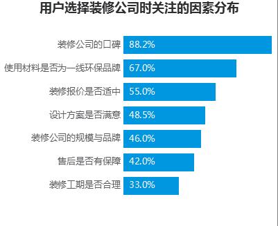 另外,根據(jù)2016年土巴兔官方網(wǎng)站調(diào)研,近9成用戶在選擇裝修公司時,最為關(guān)注的一點是口碑,對裝修環(huán)保健康、裝修報價的關(guān)注度分別位居第二、第三。針對裝修用戶最為關(guān)注的口碑問題,已有互聯(lián)網(wǎng)家裝平臺實行解決之道。
