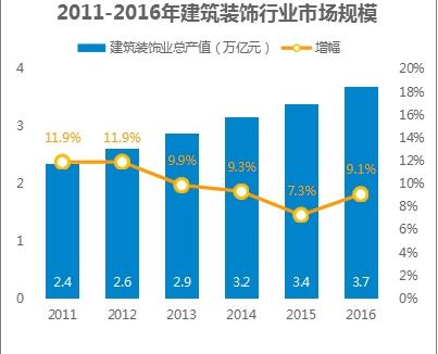 根據(jù)中國建筑裝飾協(xié)會數(shù)據(jù)顯示,2011年~2016年,建筑裝飾行業(yè)市場規(guī)模保持穩(wěn)定增長,其中家裝在整體裝修市場中所占比例在逐步攀升,將引領(lǐng)未來裝飾行業(yè)的走向。另一方面,在消費(fèi)升級下,越來越多的用戶對家居裝飾提出了更高的要求,這種情況下,透明、便利的互聯(lián)網(wǎng)家裝成為主流用戶的選擇。