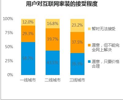 報告指出,用戶對于互聯(lián)網(wǎng)家裝的接受程度越來越高,根據(jù)2016年土巴兔官方網(wǎng)站調(diào)研可知,一線城市中近9成用戶接受互聯(lián)網(wǎng)家裝,6成用戶對互聯(lián)網(wǎng)家裝完全認(rèn)可,在二三線城市中,互聯(lián)網(wǎng)用戶也在不斷提升,互聯(lián)網(wǎng)家裝接受度在80%左右。互聯(lián)網(wǎng)家裝已經(jīng)贏得主流用戶群體的青睞。